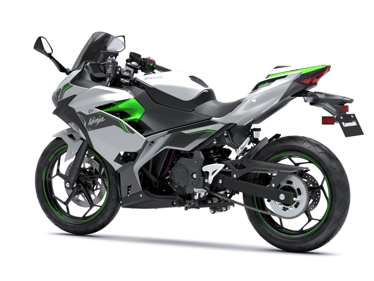 Complementando el atractivo diseño de las motocicletas Ninja y Z, el color plateado y el verde lima mate aportan una imagen fresca y futurista a los modelos EV de Kawasaki.