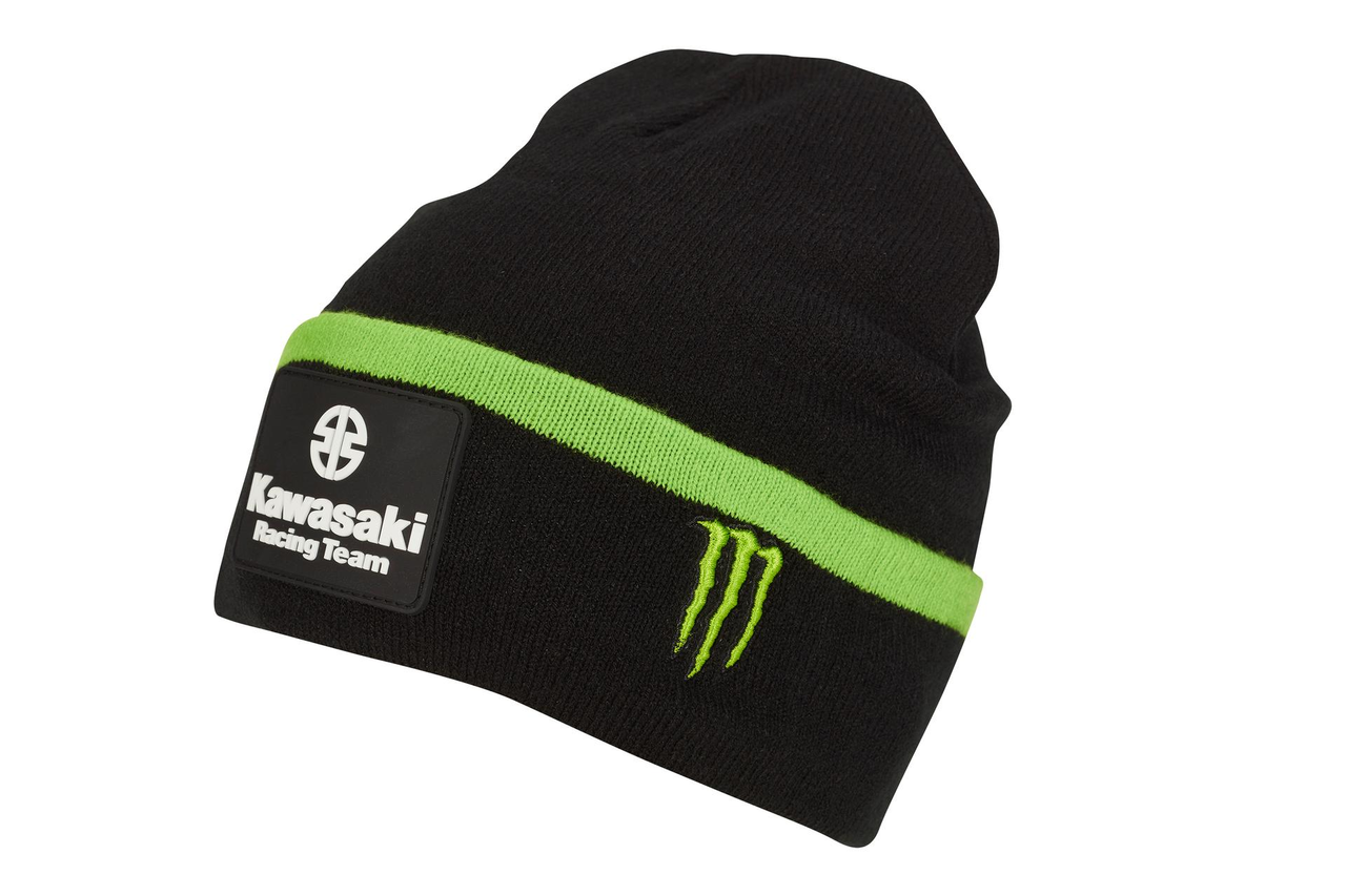 Knitted beanie with racing logos in the Kawasaki WSBK team-colours.