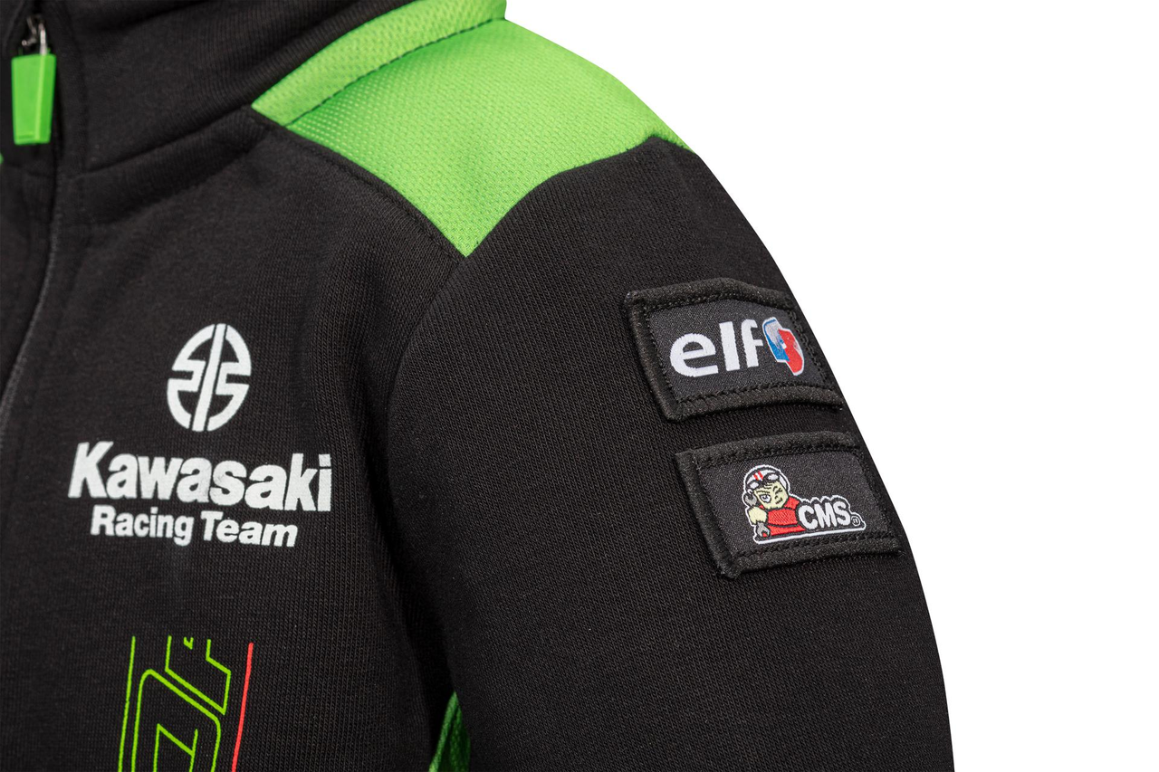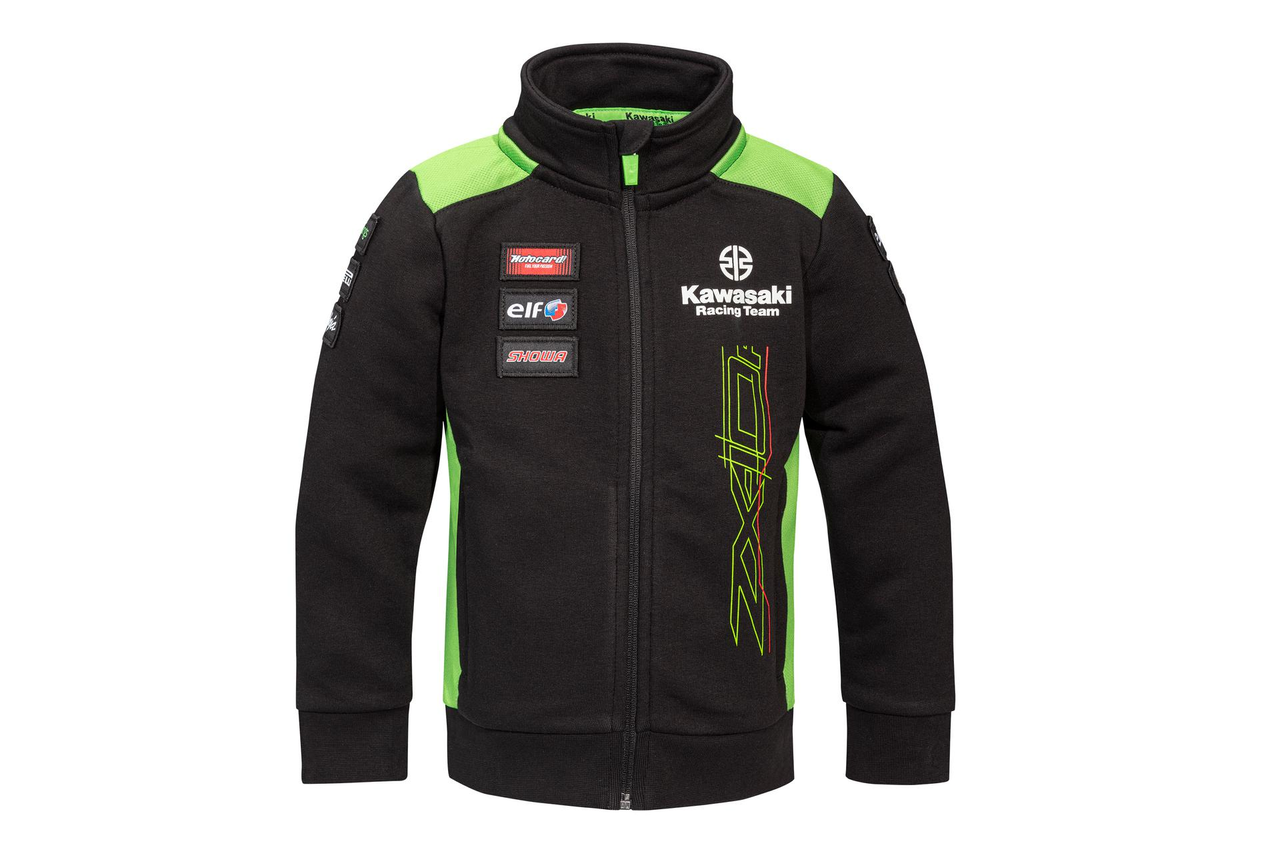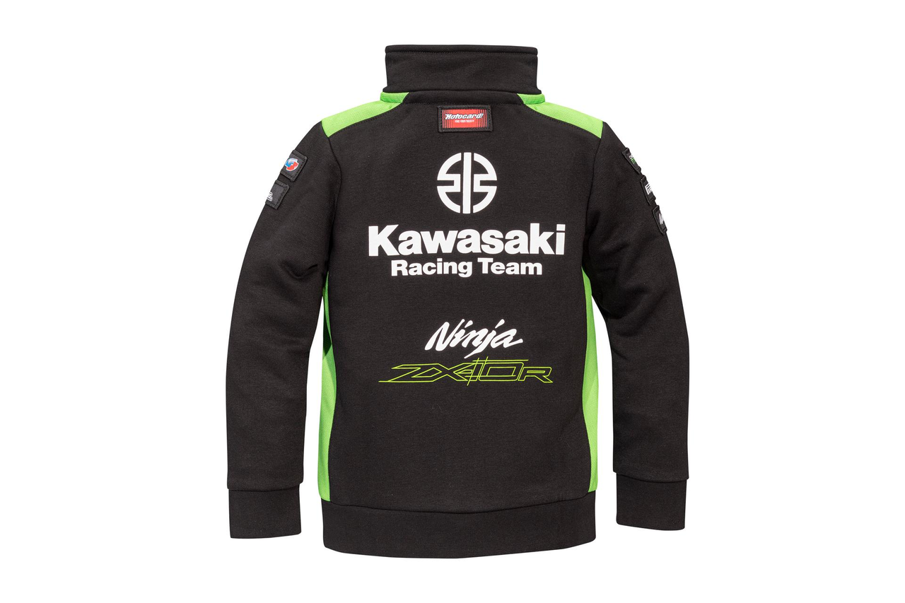 Zipped sweatshirt in Kawasaki's WSBK 2023 team-colours, with outer pockets, standup collar and ribbed hem and cuffs.