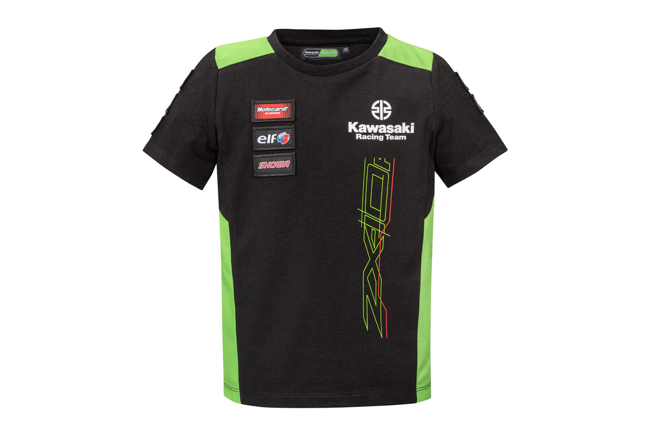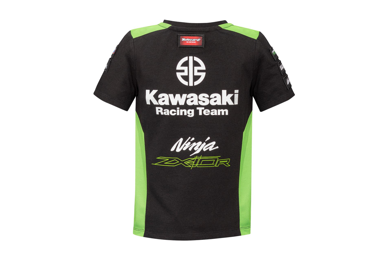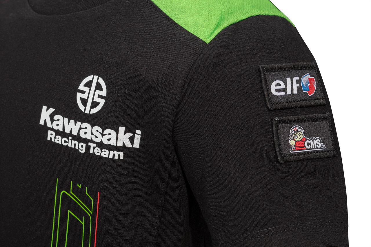 Short sleeved rounded neck t-shirt in Kawasaki's WSBK 2023 team-colours and graphics.