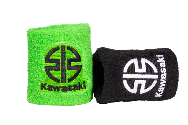 A set of green and black wrist- / sweatbands branded with the Kawasaki rivermark logo. 95% cotton and 5% elastane. 8x8cm.
