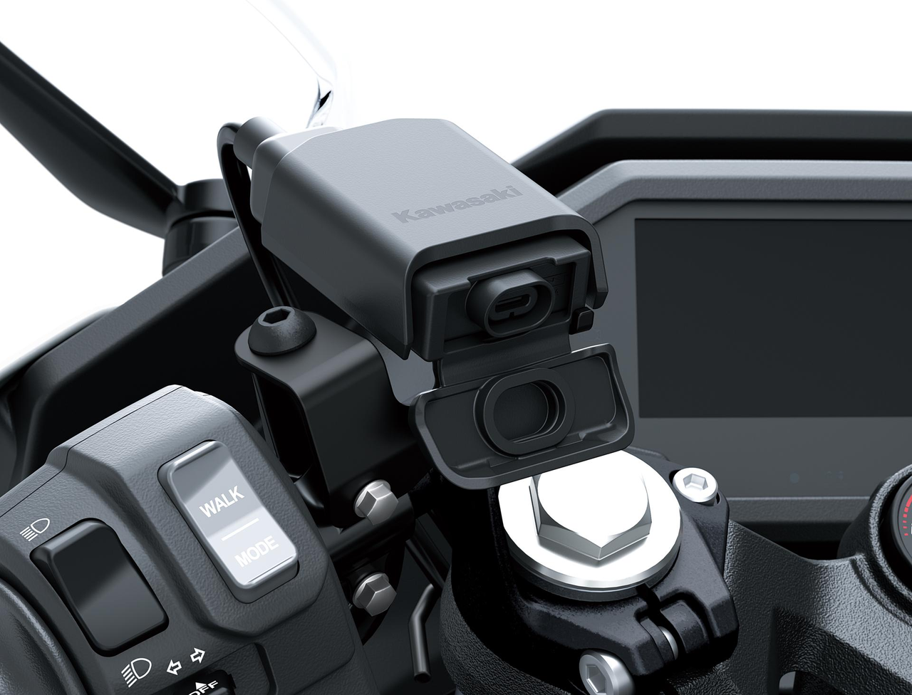 Water resistant USB-C outlet conveniently mounted on the handlebar. Vibration damped and socket can be sealed with cap. Total maximum output is 3A. (To operate, the relay kit should be installed)(Available separately)