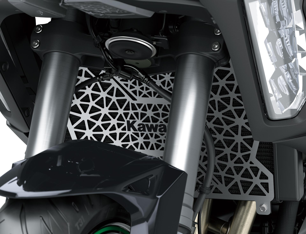 Protege el radiador frente a impactos de piedras y suciedad con estas rejillas metálicas robustas con logotipo Kawasaki exclusivo cortado a láser. El diseño perforado mejora el flujo de aire manteniendo un peso mínimo.