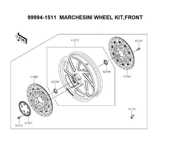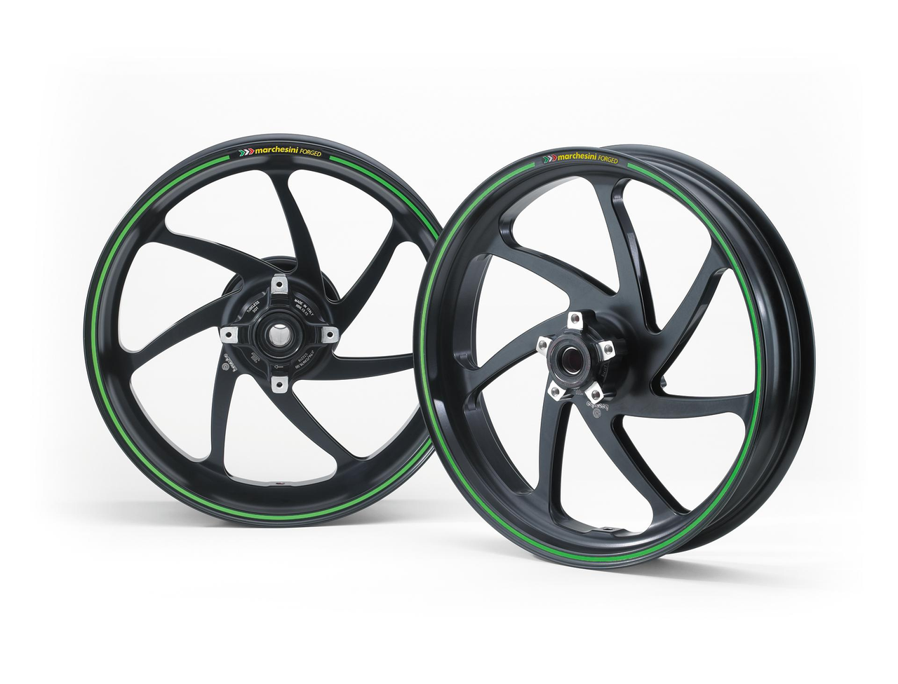 Kit de rueda delantera Marchesini de aluminio ligero. Incluye una llanta delantera de aluminio forjado Marchesini con banda decorativa, dos discos de freno delanteros, un anillo sensor ABS delantero, diez tornillos para sensor ABS/discos delanteros y una válvula lateral de aluminio.